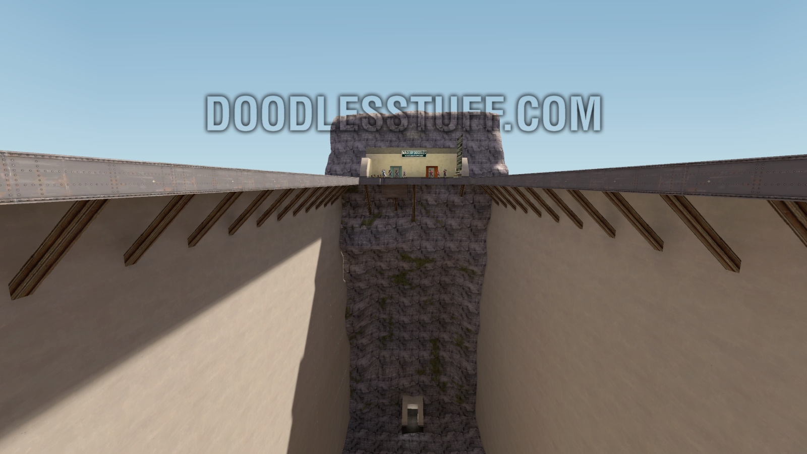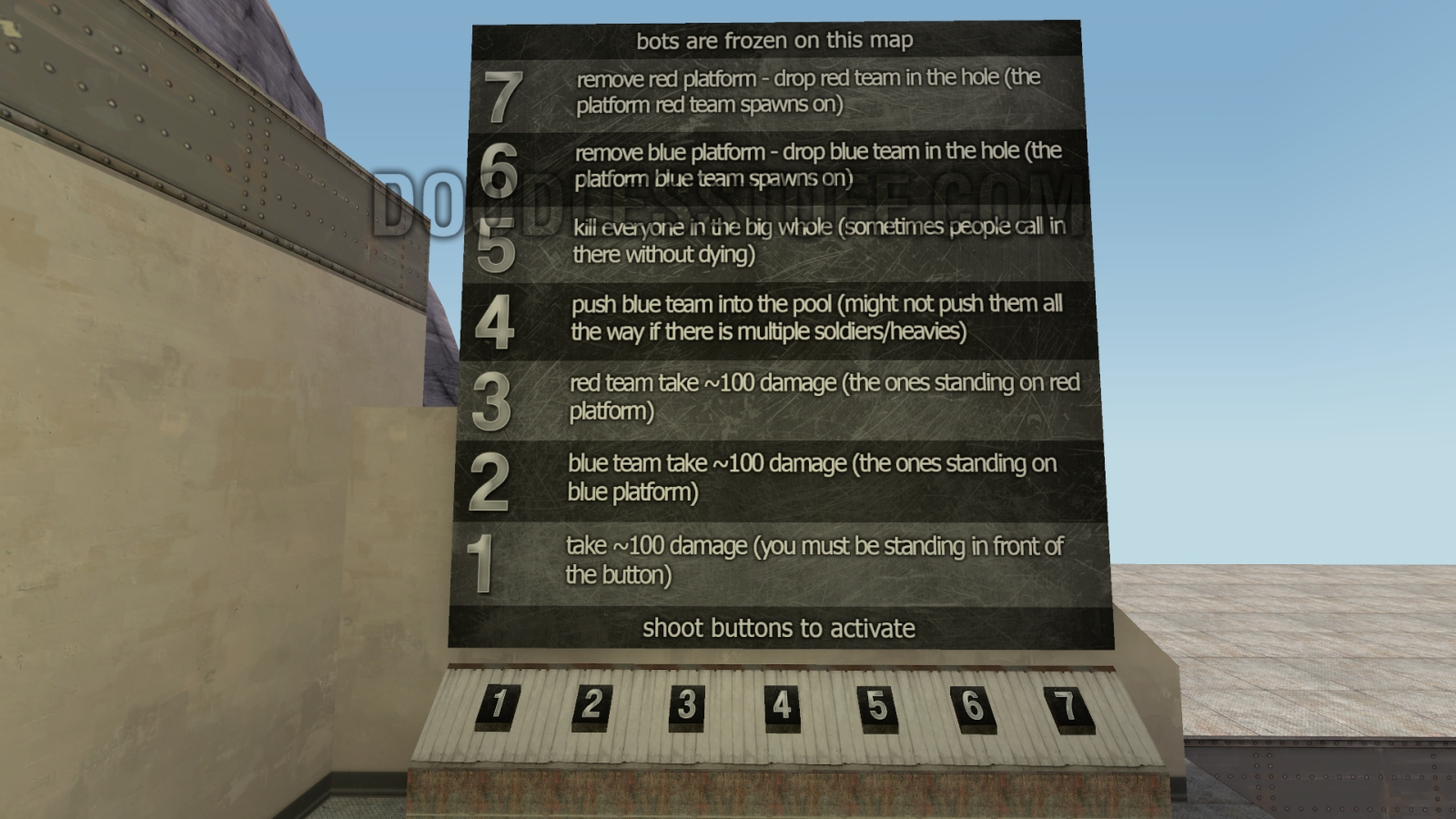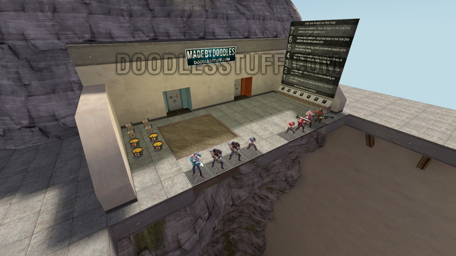The map is a long deep hole with a platform around the edge. There is a resupply area at one end where both teams spawn on platforms. In the resupply area there is buttons to do various things and pool. There is a teleport in the hole back to the resupply area.