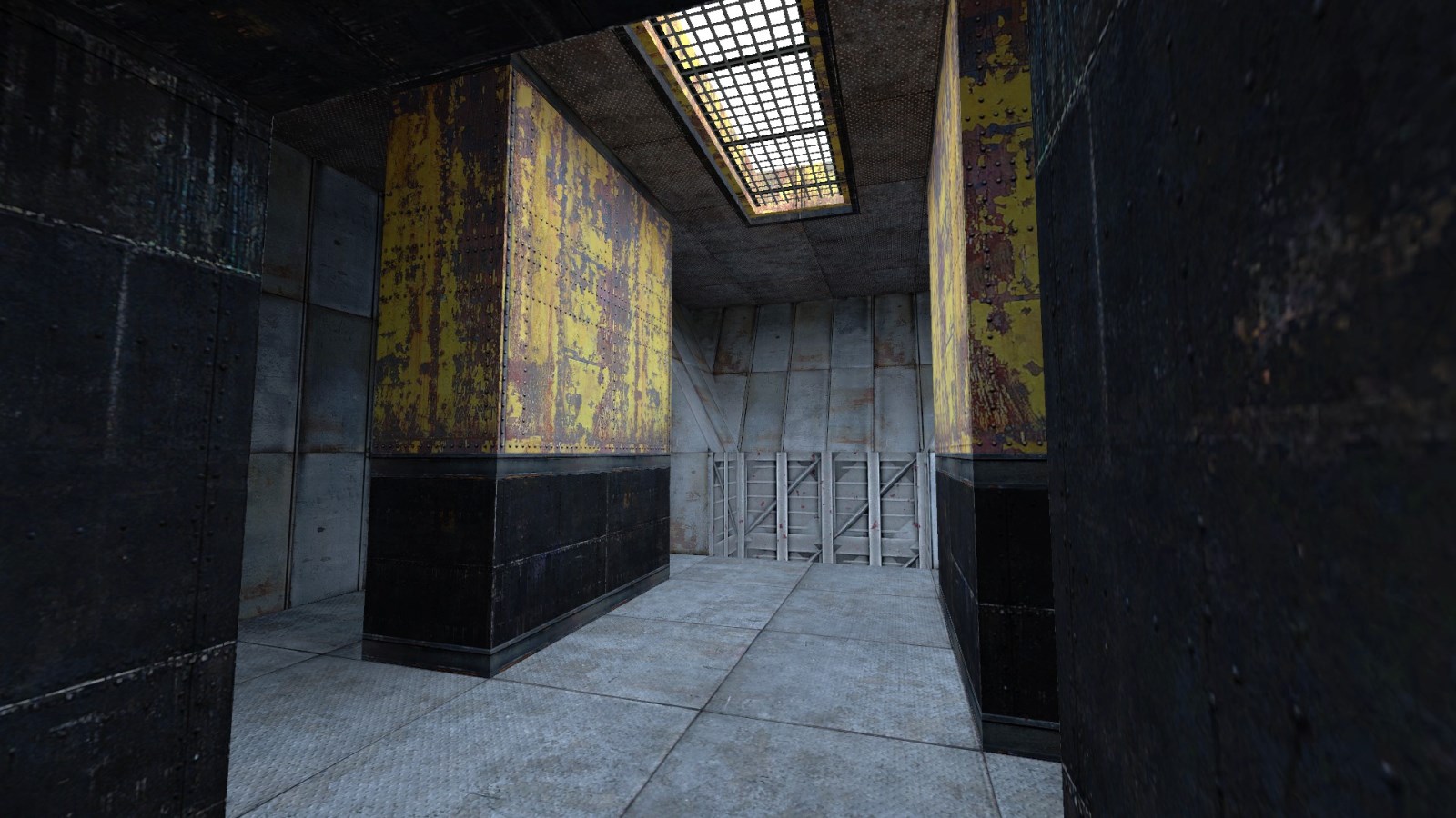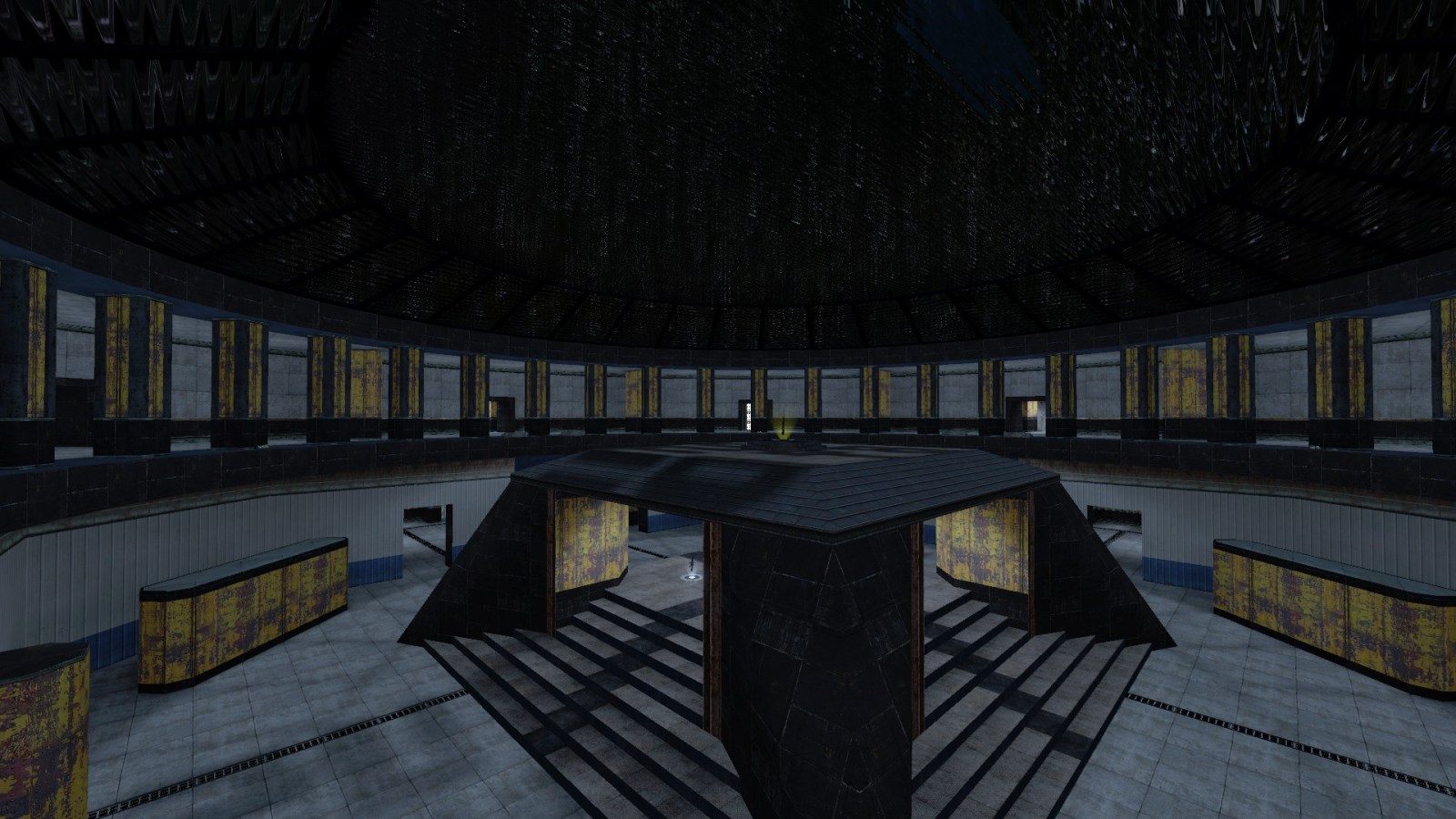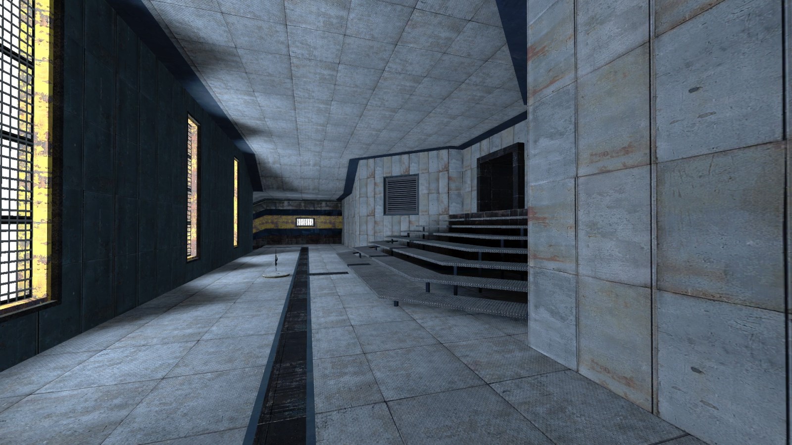 The map is a multilevel symmetrical indoor map. Spawn points are scattered all over the map. Guns are placed across the map. Health kits and armor in also in the map. In the classic deathmatch style you run around the map, killing people, healing, getting guns/ammo and getting armor. I have attempted to create a map so this can be done with the Source feel.
