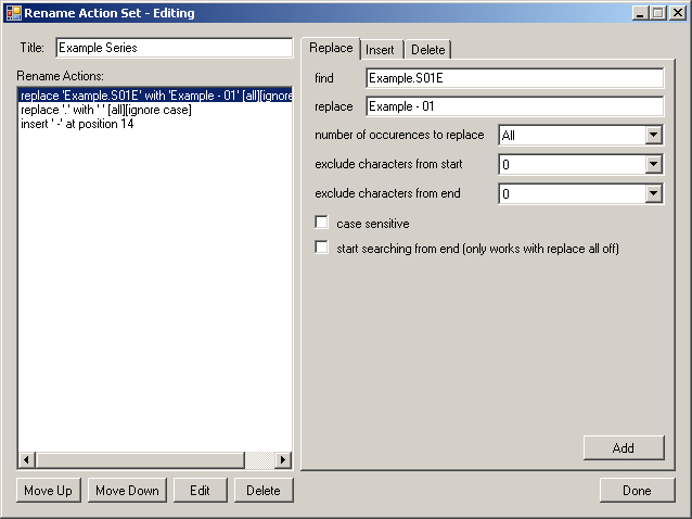 These 'rename actions' include:- Replace: Find and replace a piece of text within the filename