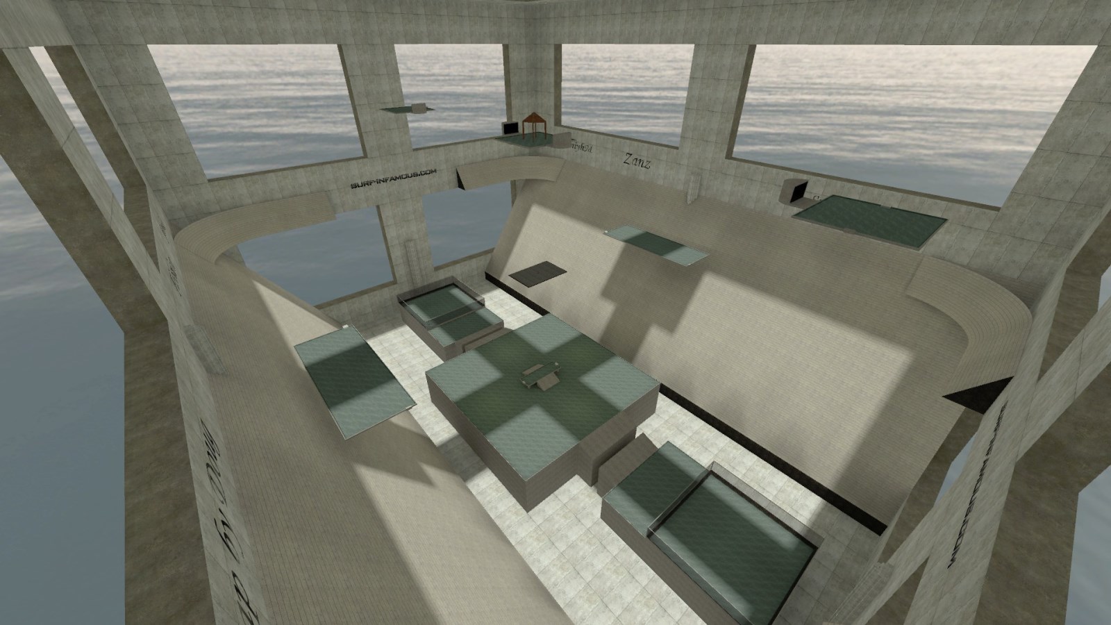 On this map the teams spawn in seperate areas with only knives. From your spawn area you drop down into a Secondary Run. There are four surf paths or varying difficulty giving you a pistol. Obviously the better pistols are on the harder paths. From the secondary run you are teleported to the Primary Run. The primary run has the same idea as the secondary run; four paths of varying difficulty giving you a primary weapon based on the difficulty, except the primary surf paths are much longer and harder. From the primary run you are teleported to the Combat Arena. Each team has its own (yet identical) secondary and primary runs. In the combat arena you will meet the other team and there you do battle.